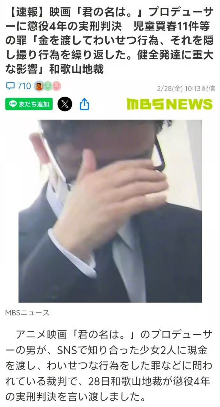 据当地媒体报道,电影《你的名字》制片人伊藤耕一郎涉嫌要求未成年少女传裸照及进行性交易,被判4年有期徒刑。《你的名字》导演新海诚对此表示震惊。